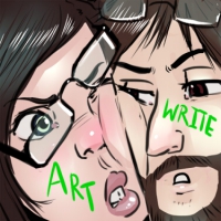 We're a two-person team, artist and writer, and we do the weird stuff. (We do the weird stuff...)