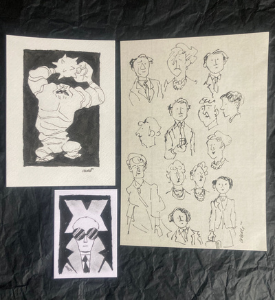/ monthA randomly chosen piece of postcard original art, a randomly chosen piece of trading card original art and a randomly chosen page from my sketch book sent to you every month. Random but original. All ink on paper.