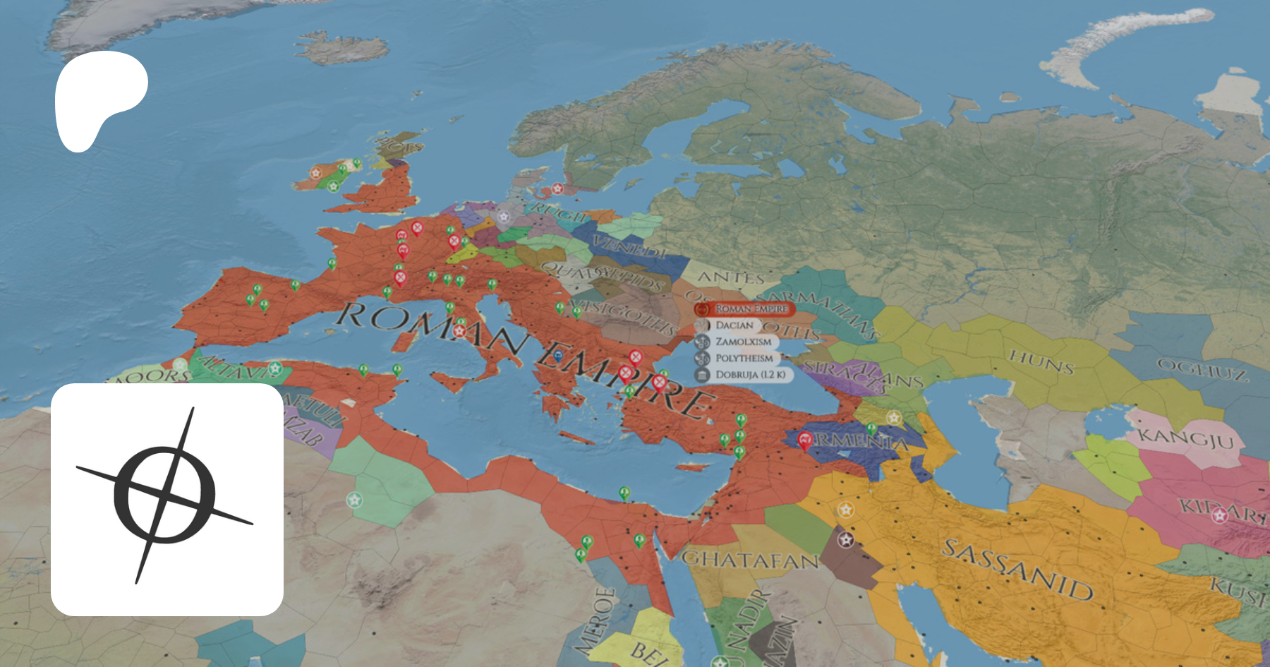 Chronas is a history map application with over 50 million data points which every registered user can curate and contribute to.It may be described as a mix of Open Street Map, Wikipedia and Google Earth. It maps 4000 years of historic rulers (polictical entities), cultures, and religions on a map linking to related Wikipedia articles as well as various kinds of different markers such as people, battles, cities, castles etc.