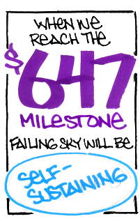 I would love to, one day, be making the same amount of money as I was when I was a college instructor, before I struck out to support myself with independent projects. It is my lifelong dream to make art for living: saving for retirement, taking out a mortgage on a house, making donations to other artists, proving that this is a real profession in a capitalist economy, being able to take time to make non-lucrative fine art on the side. If Failing Sky is an important enough part of enough peoples' lives to deserve $1500/scene, it would be a dream come true and I would be forever grateful.