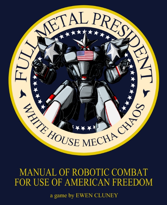 It took a lot longer than I'd planned (due to a huge confluence of different things), but Fullmetal President is finished. It is a very silly little game, and more than anything an excuse to narrate explosions and mess around with surreal Americana. Regardless I hope you have fun with it. It was tremendous fun to make and playtest. One of my friends played Dogg McCool, the White House Dog (named by the First Daughters), and it was all-around amazing. Kyle Shaezer did three pieces of phenomenal artwork for the game, including a fantastic cover design. I don't normally do much in the way of mecha stuff, so his mecha fanboy expertise was instrumental in achieving the right look. In any case, the actual Fullmetal President PDF will be going out to patrons at the $4 level and above momentarily!