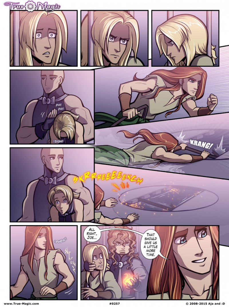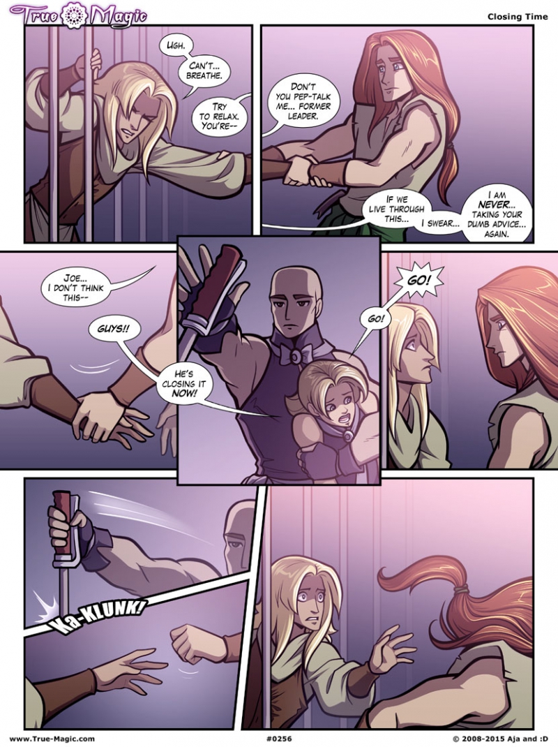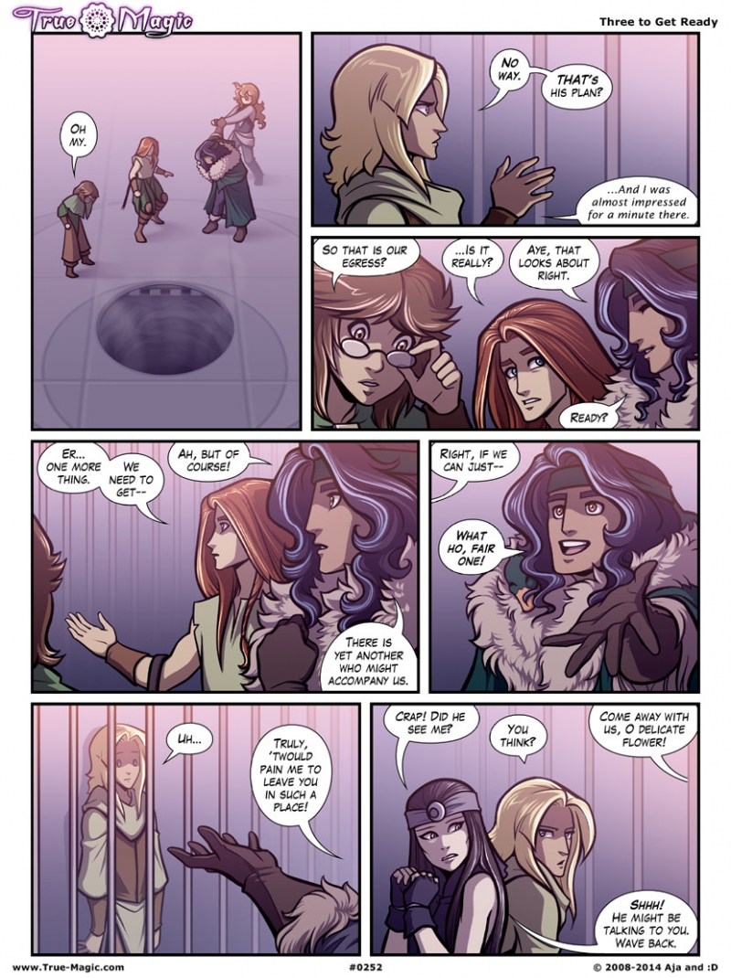 Jennifer Hilty Doggonit, guys, can we just work together for a minute. XD I just have this feeling that Richard is going to come bursting back out of the pit because he realized they hadn't followed and muscled his way back up the vertical slope. Then he'll smack the fire guy on the head, bend the bars open for Joe, and everyone can go on their merry way. Because come on, it's Richard. My favorite part of this page is the bruiser giving Jim a consoling pat. "It's alright, m'lord, you tried. I'm just very good at my job."