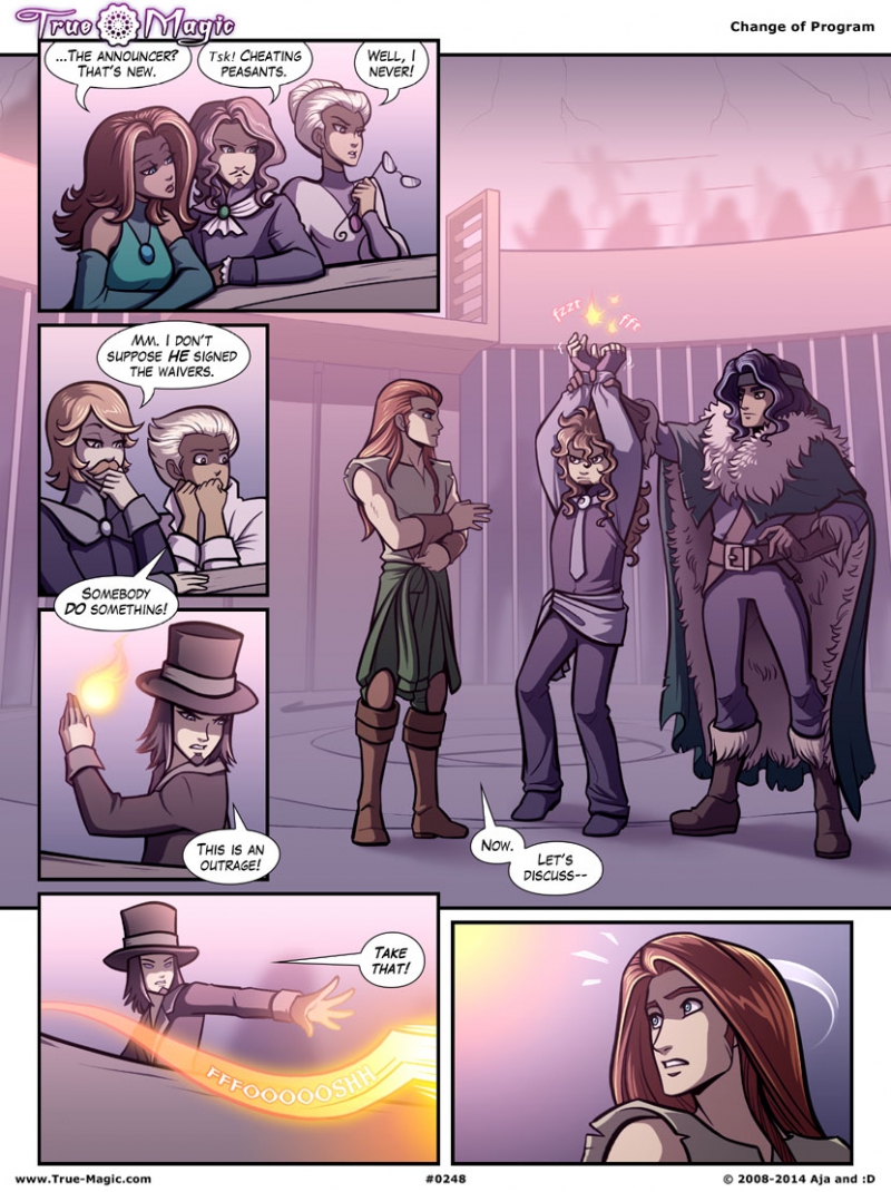 Jennifer Hilty Well well WELL! And we're back at the ring! And it looks like someone is actually bothering to intervene. I feel it won't go well for them. I love how the lady is just like, "That's new", indicating that people getting kidnapped from the stands is not an irregular occurrence. XD But at least the guys are being original! Perhaps it will work this time! Huzzah for scripting progress! =D It's rather reassuring to me that accomplished comicers like yourself script as you go; sometimes I worry that we're supposed to have the whole dang story plotted out ahead of time. ^^; Whatever your process, it seems to be working quite splendidly! Can't wait to see what happens next for the gang.